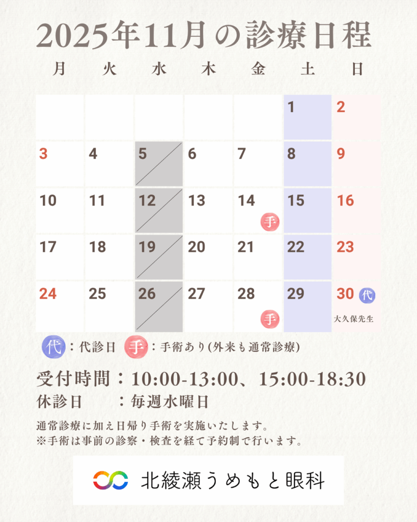 2025年9月1日(月)、ららテラス北綾瀬に新しく開院いたします、北綾瀬うめもと眼科です。 地域の皆様の健康に貢献できるよう、スタッフ一同、丁寧な診療を心がけてまいります。 皆様のご来院を心よりお待ちしております。 -