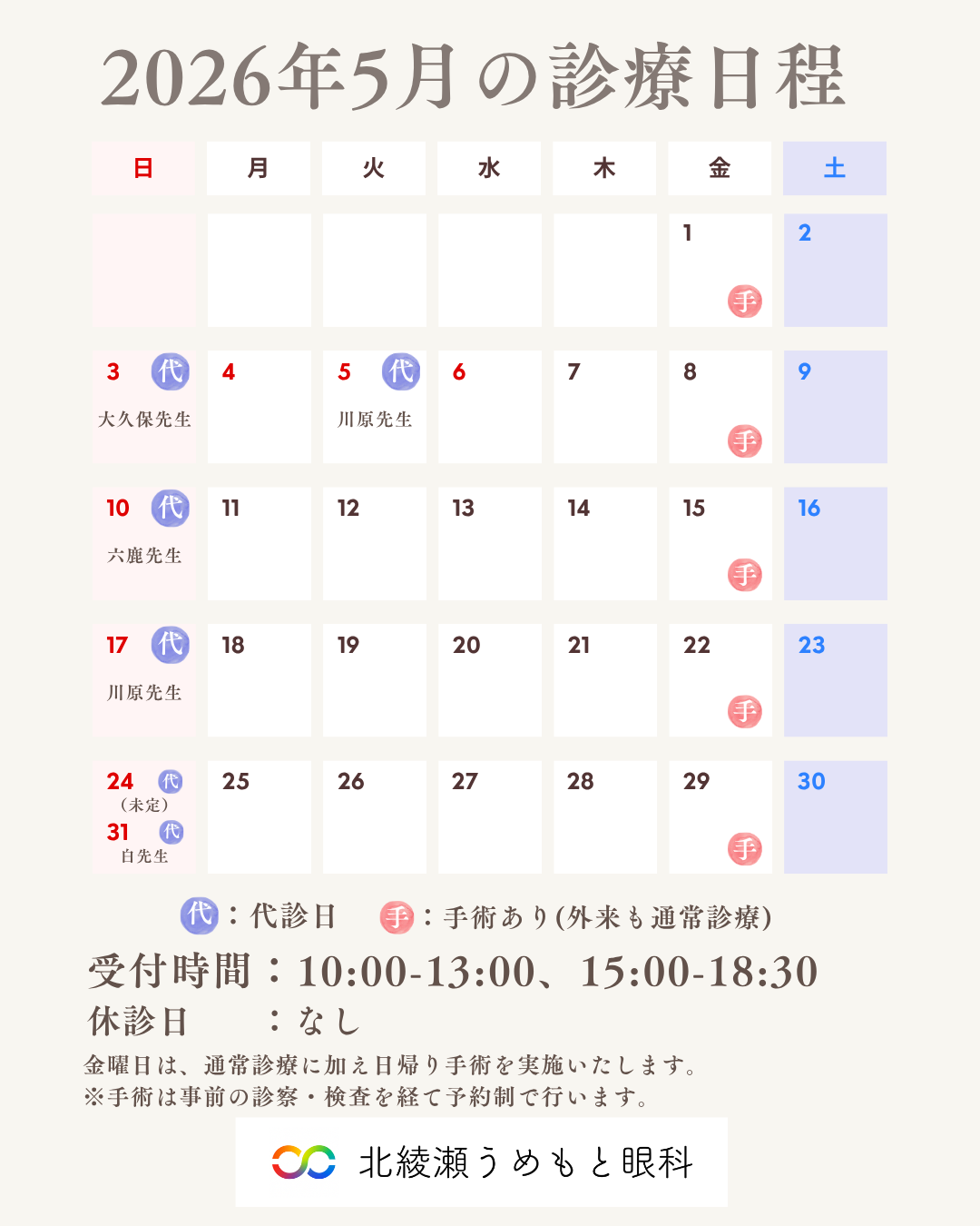 2026年5月の診療日程のお知らせ | 北綾瀬うめもと眼科|ららテラス北綾瀬の眼科|駅直結・土日祝も診療|